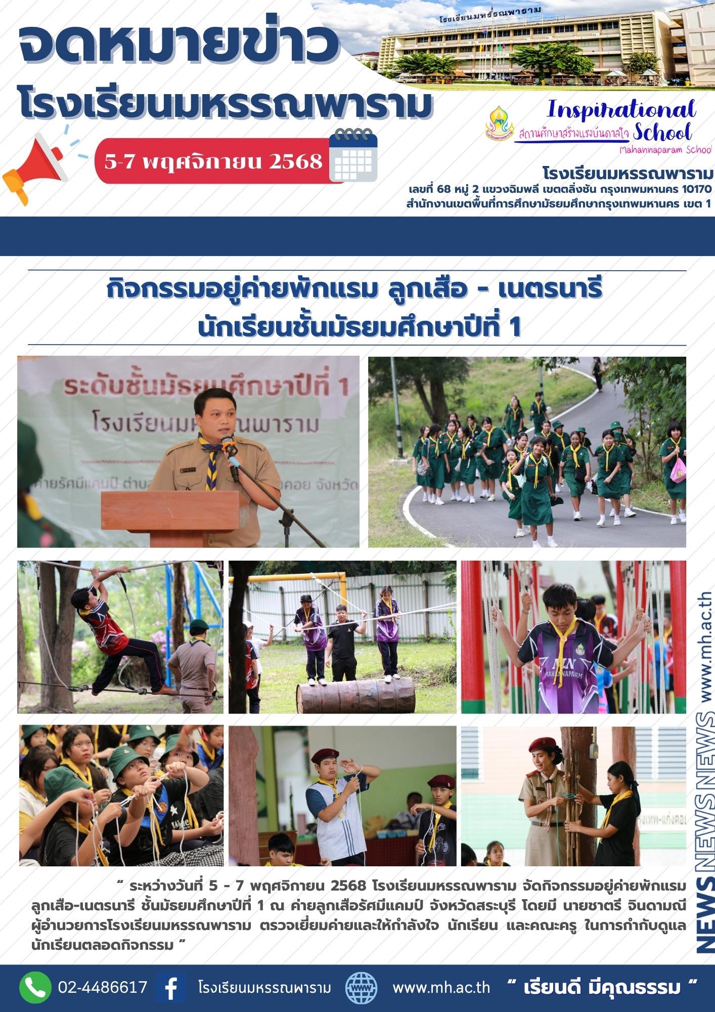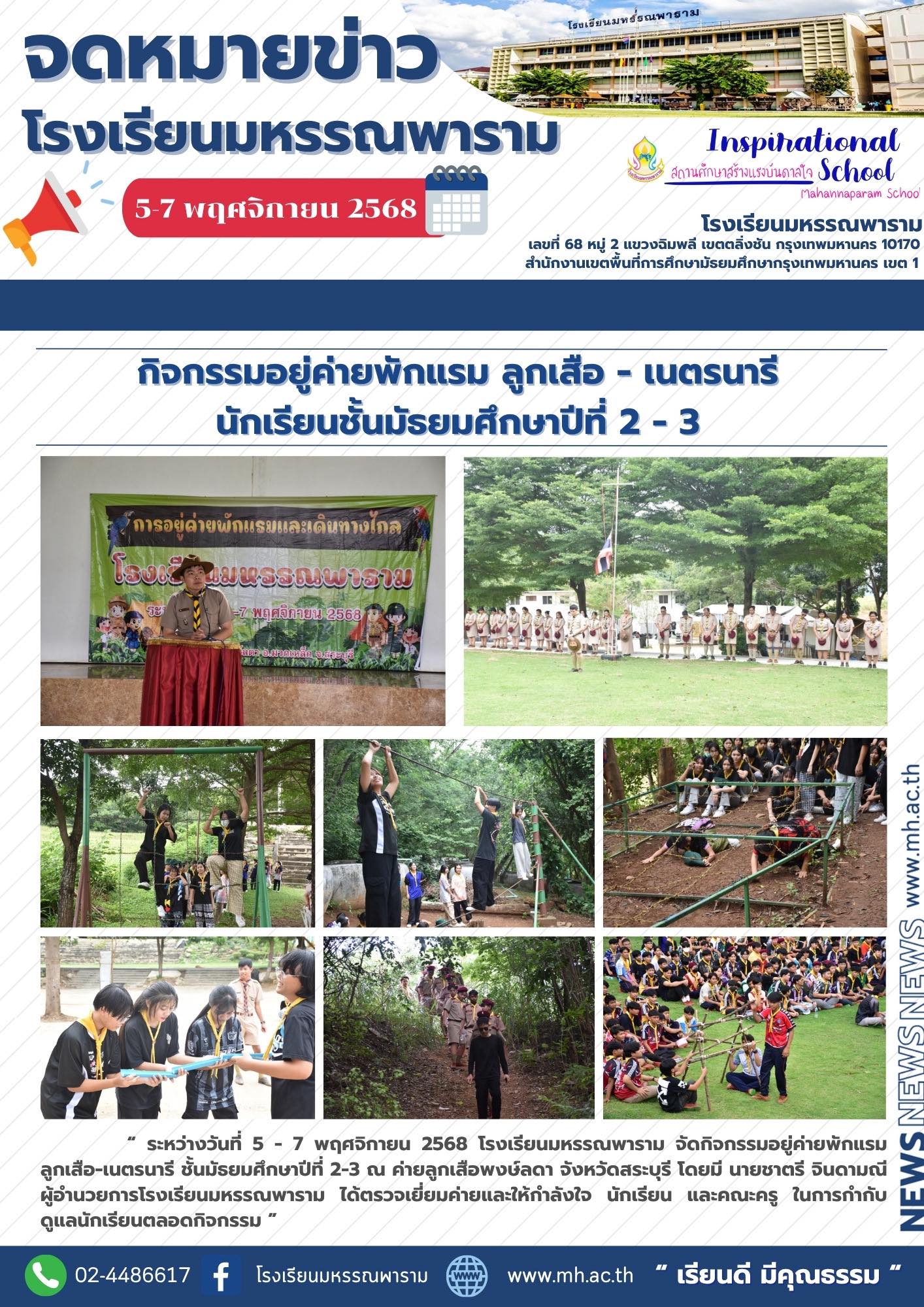ในวันที่ 5-7 พฤศจิกายน 2568 โรงเรียนมหรรณพาราม จัดกิจกรรมค่ายพักแรม ลูกเสือ - เนตรนารี ชั้นมัธยมศึกษาปีที่ 1 ค่ายลูกเสือรัศมีแคมป์ จังหวัดสระบุรี โดยม...