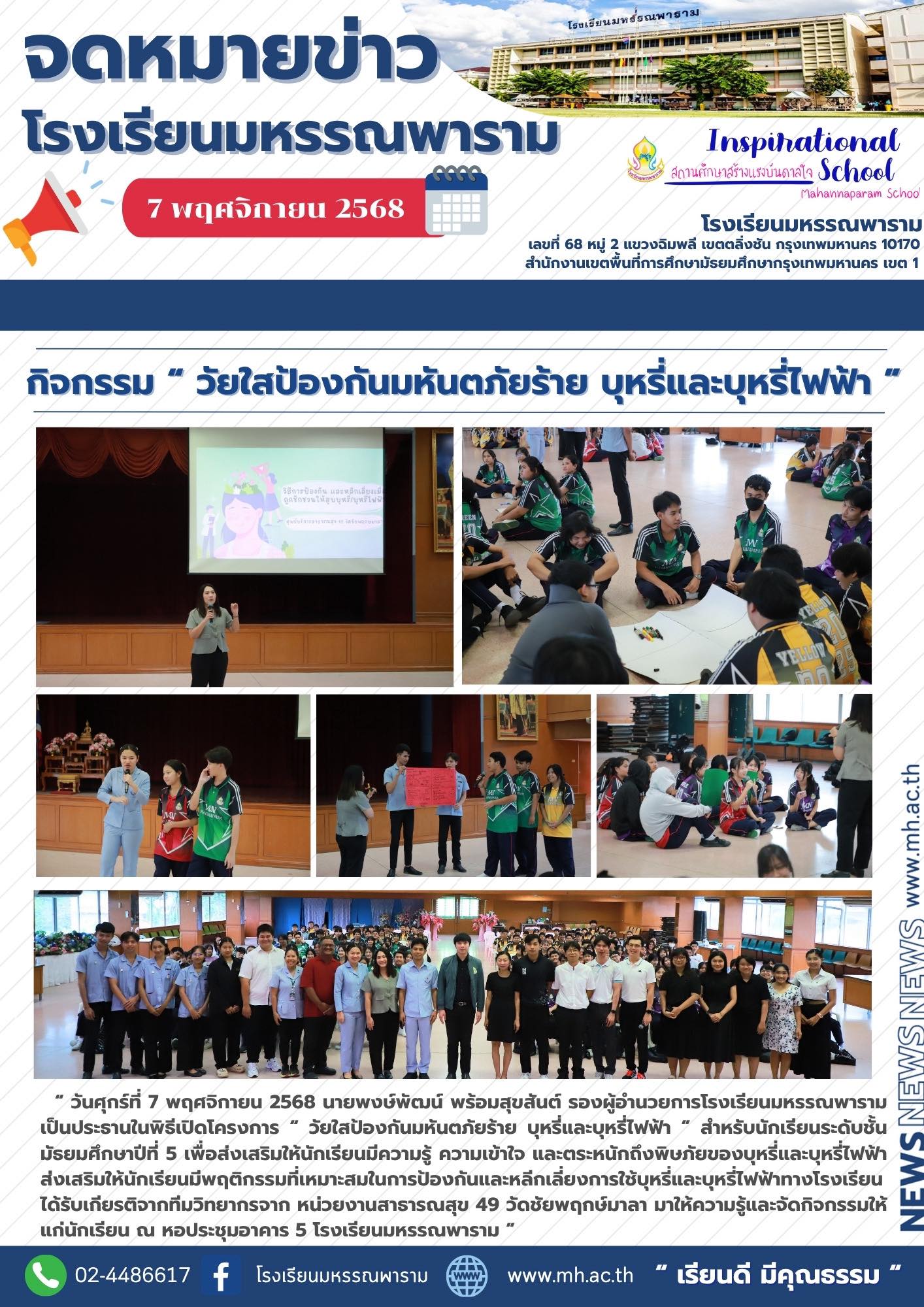 วันศุกร์ที่ 7 พฤศจิกายน 2568 นายพงษ์พัฒน์ พร้อมสุขสันต์ รองผู้อำนวยการโรงเรียนมหรรณพาราม เป็นประธานในพิธีเปิดโครงการ “วัยใสป้องกันมหันตภัยร้าย บุหรี่แ...