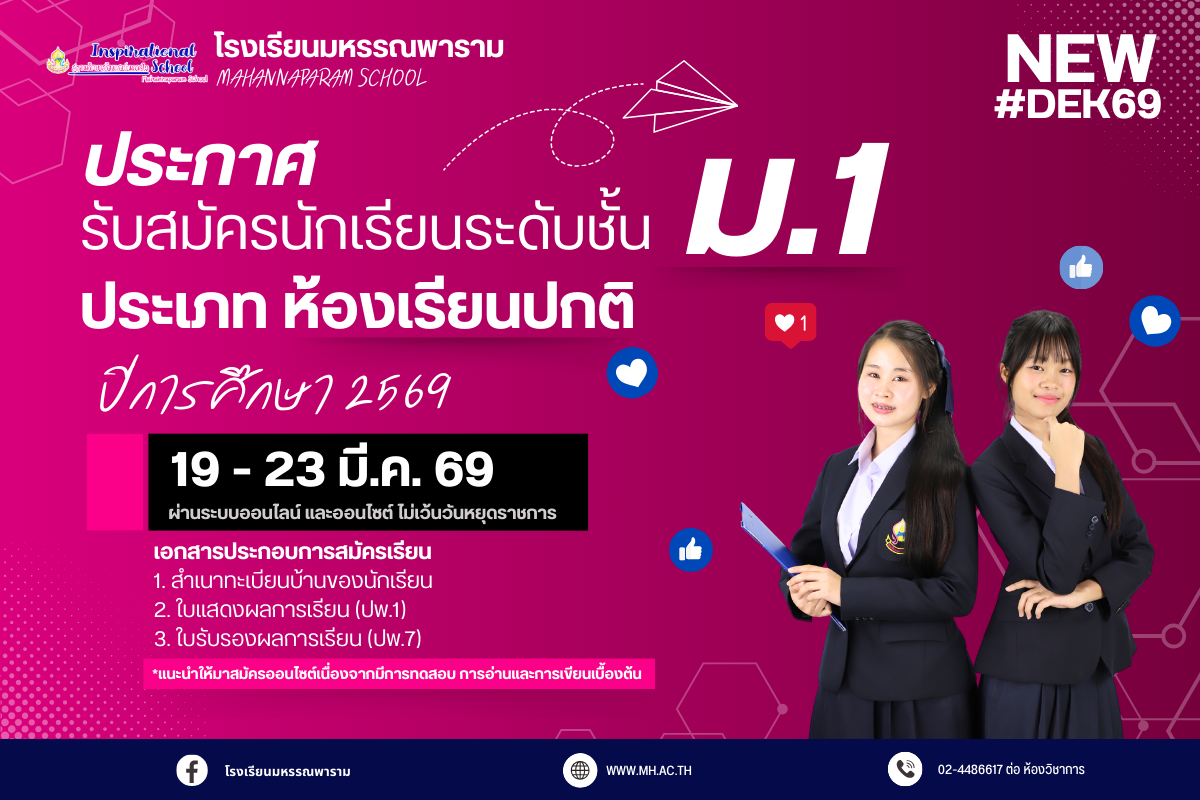 ประกาศรับสมัครนักเรียนชั้นมัธยมศึกษาปีที่ 1 ปีการศึกษา 2569