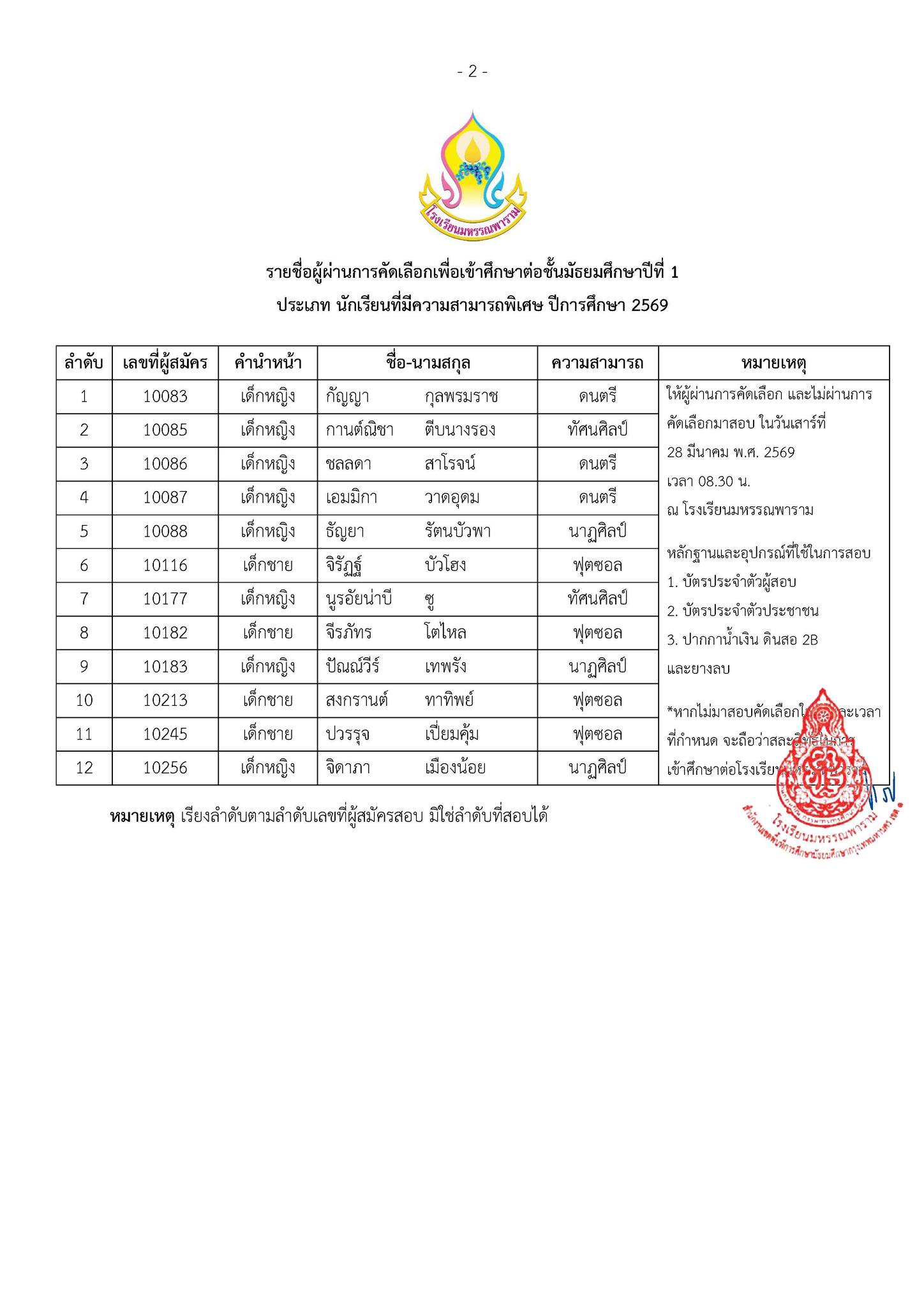 ให้ผู้ที่ผ่านการคัดเลือกและไม่ผ่านการคัดเลือก มาสอบจัดห้องเรียนในวันเสาร์ที่ 28 มีนาคม 2569 เวลา 8:30 น.