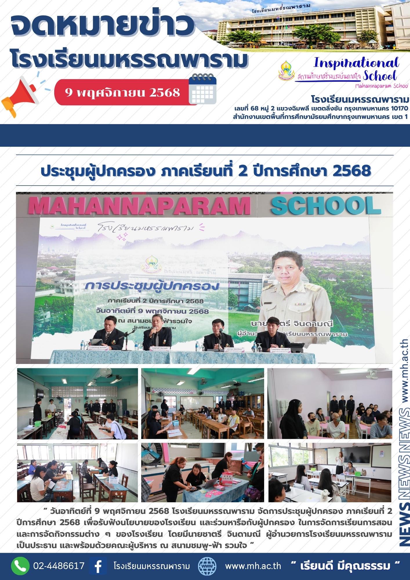 วันอาทิตย์ที่ 9 พฤศจิกายน 2568 โรงเรียนมหรรณพาราม จัดการประชุมผู้ปกครอง ภาคเรียนที่ 2 ปีการศึกษา 2568 เพื่อรับฟังนโยบายของโรงเรียน และร่วมหารือกับผู้ป...