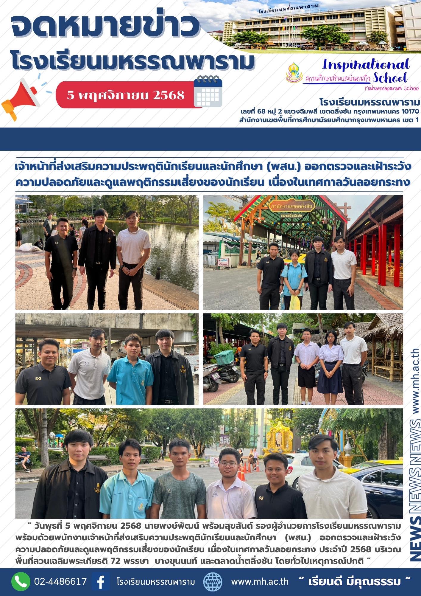 วันพุธที่ 5 พฤศจิกายน 2568 นายพงษ์พัฒน์ พร้อมสุขสันต์ รองผู้อำนวยการโรงเรียนมหรรณพาราม พร้อมด้วยพนักงานเจ้าหน้าที่ส่งเสริมความประพฤตินักเรียนและนักศึก...