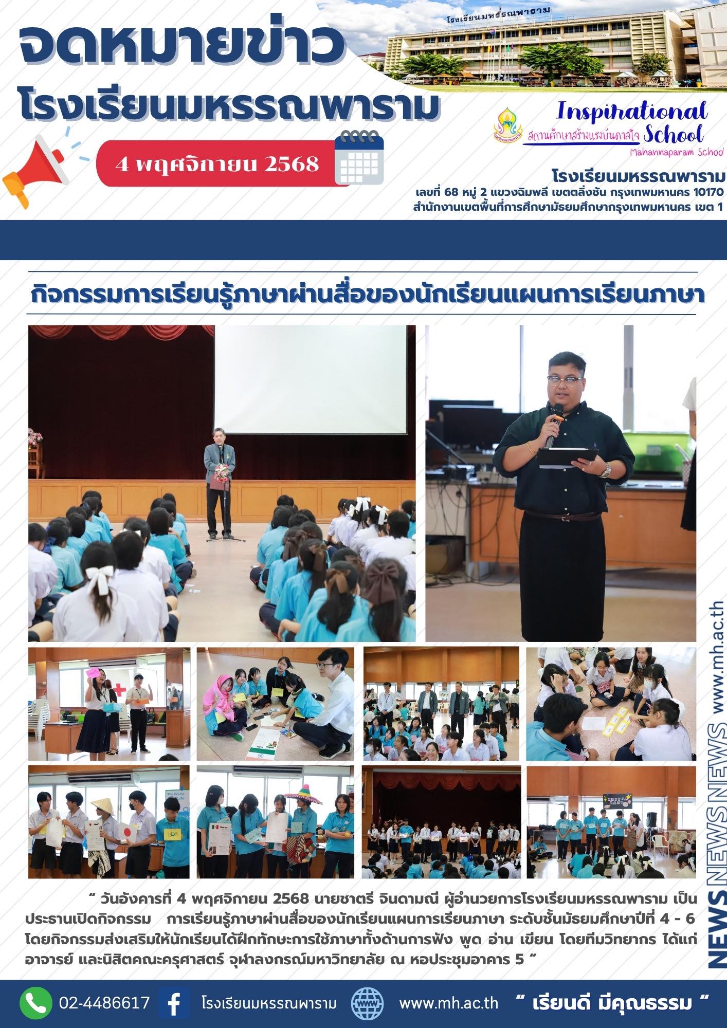 วันอังคารที่ 4 พฤศจิกายน 2568 นายชาตรี จินดามณี ผู้อำนวยการโรงเรียนมหรรณพาราม เป็นประธานเปิดกิจกรรม การเรียนรู้ภาษาสื่อของนักเรียนแผนการเรียนภาษา ระดั...