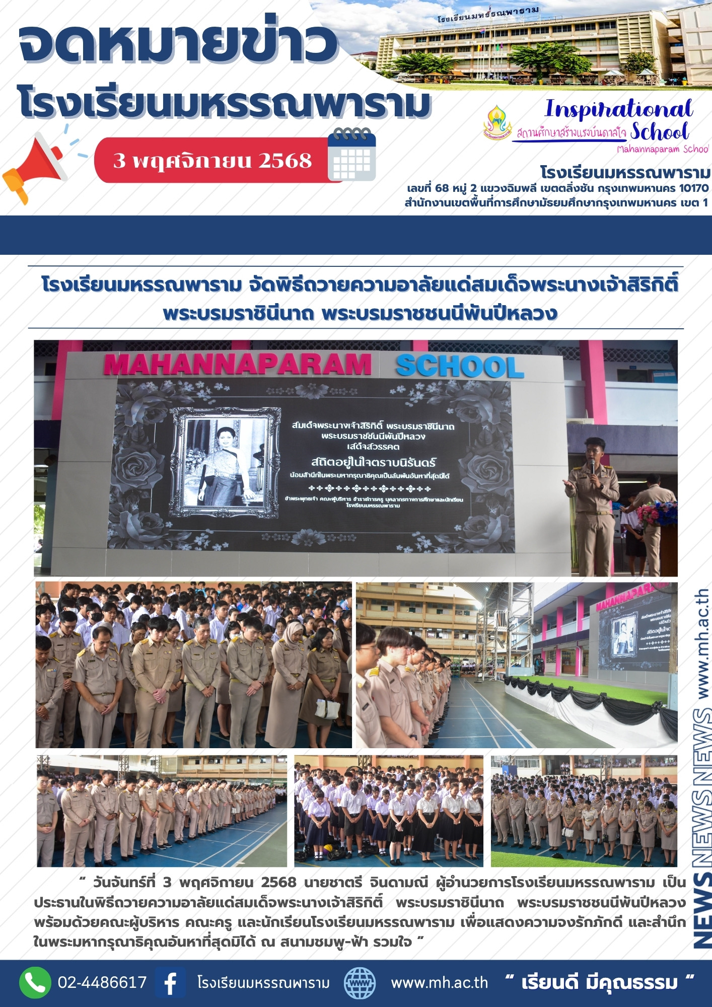 วันจันทร์ที่ 3 พฤศจิกายน 2568 นายชาตรี จินดามณี ผู้อำนวยการโรงเรียนมหรรณพาราม เป็นประธานในพิธีถวายความอาลัยแด่สมเด็จพระนางเจ้าสิริกิติ์ พระบรมราชินีนา...