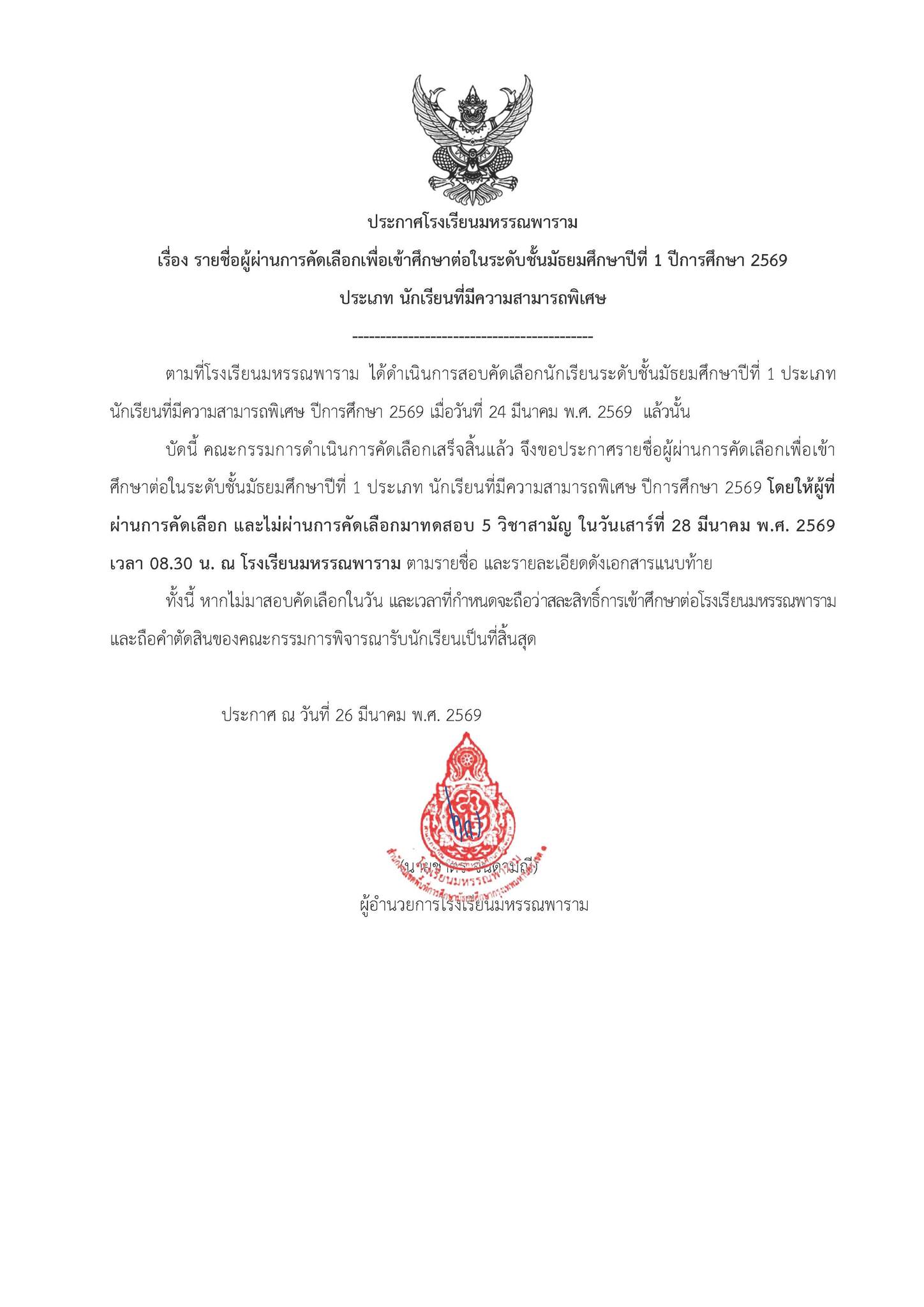 ให้ผู้ที่ผ่านการคัดเลือกและไม่ผ่านการคัดเลือก มาสอบจัดห้องเรียนในวันเสาร์ที่ 28 มีนาคม 2569 เวลา 8:30 น.